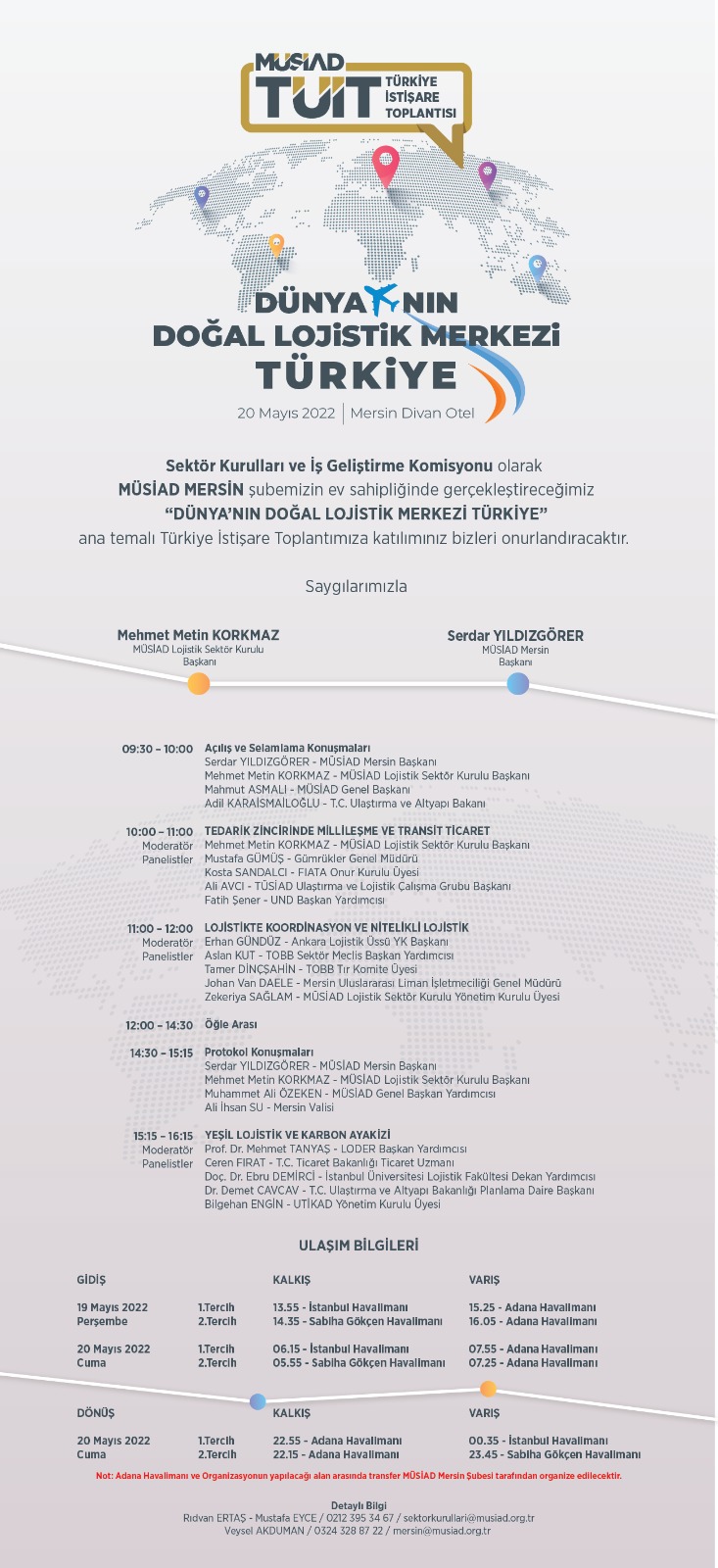 MÜSİAD Sektör Kurulları ve İş Geliştirme Komisyonu tarafından MÜSİAD Mersin Şubesi ev sahipliğinde 'Dünya'nın Doğal Lojistik Merkezi Türkiye' temasıyla Türkiye İstişare Toplantısı (TÜİT) düzenlenecektir. Toplantı, 20 Mayıs 2022 günü saat 09:00'da Mersin Divan Otel'de gerçekleştirilecektir.