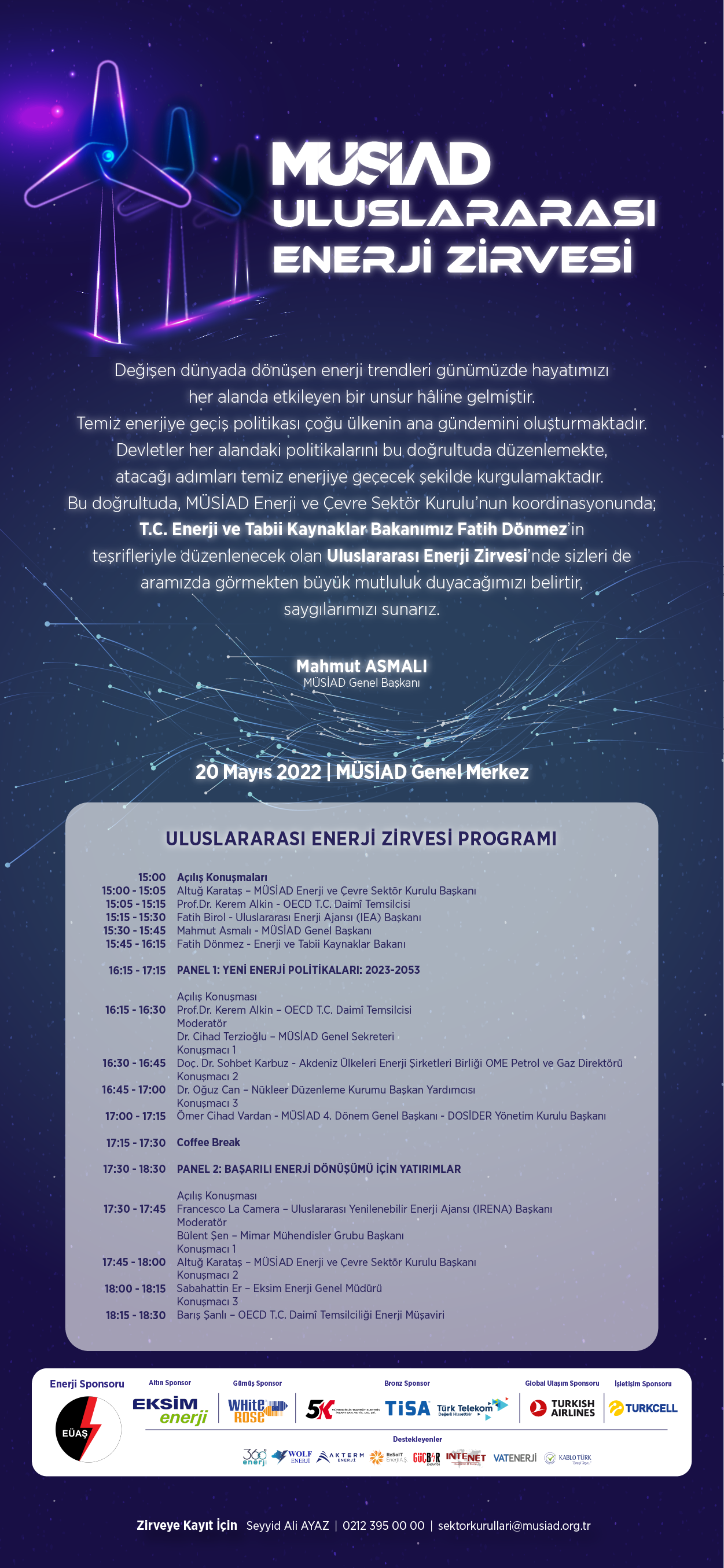 MÜSİAD Enerji ve Çevre Sektör Kurulu koordinasyonunda, T.C. Enerji ve Tabii Kaynaklar Bakanı Sayın Fatih Dönmez'in katılımlarıyla, 20 Mayıs 2022 günü saat 15:00'te, MÜSİAD Uluslararası Enerji Zirvesi düzenlenecektir.